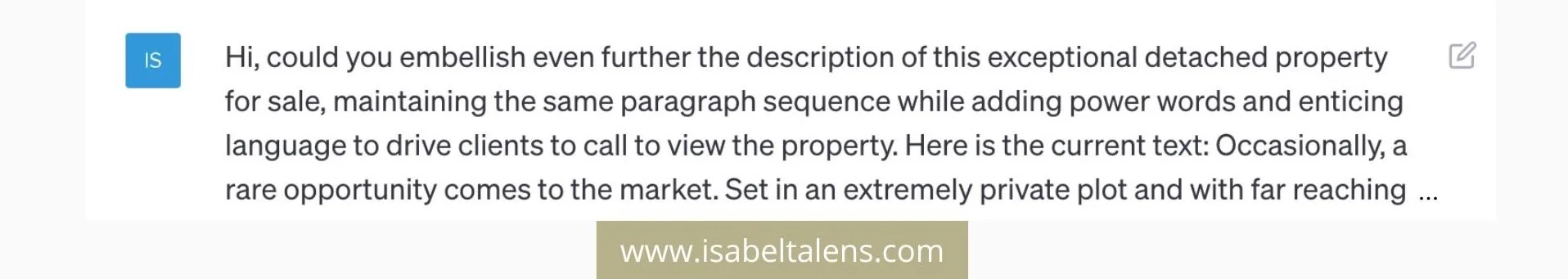 When the first draft verbatim of our house sale marketing ad came from our estate agent a bit, let’s say it, bland, I used Chat GPT prompts to spice it up. I admit that anyone else would have been happy with what they did… The thing is, when you do online marketing, your eyes get used to seeing how things could have more impact. Haha!